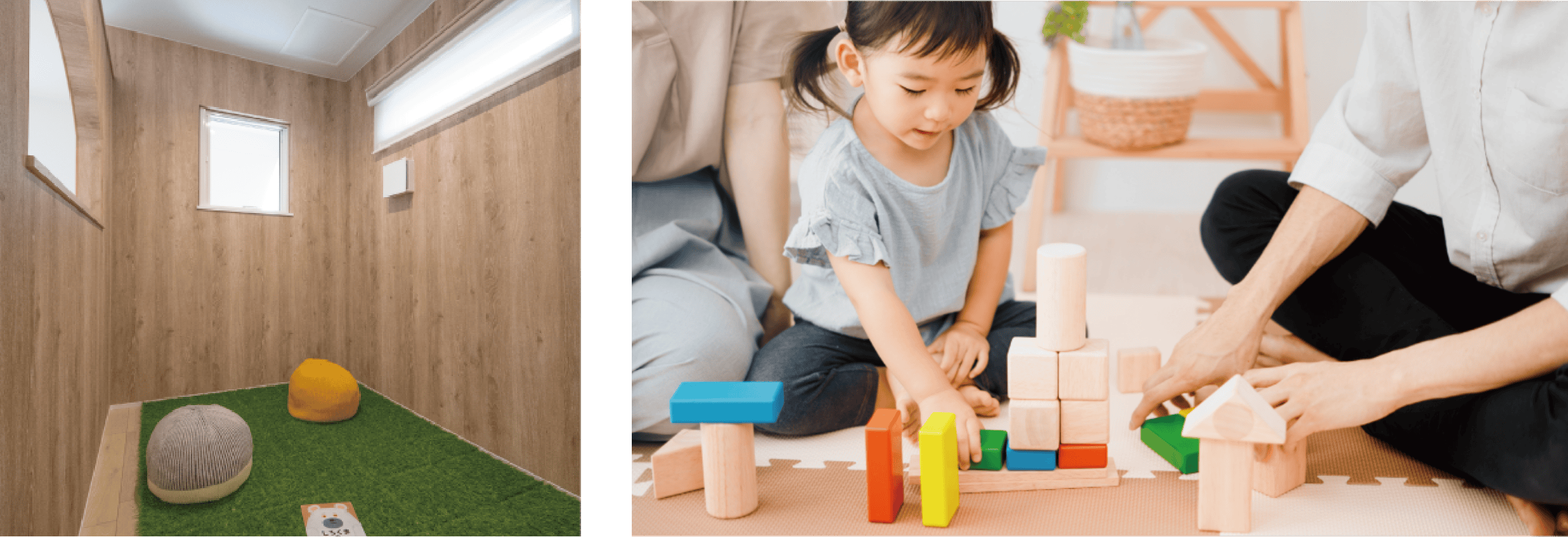 お絵かきや積み木遊びなど、親子三世代が自然と集まる場所です。安全性と見守りやすさに配慮しながら、遊び心を大切にした空間。笑顔と会話が生まれる、家族みんなの憩いの場所。