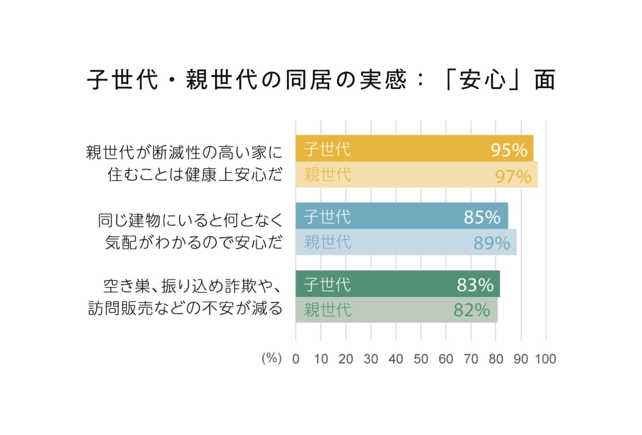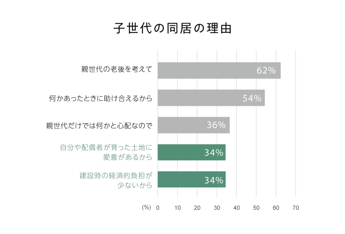 子世代の同居理由として「育った土地への愛着」が34%を占め、経済的負担の軽減と同率であることが判明しました。子育て世代は、建設費などの経済面だけでなく、地元への愛着から戻ることを選び、祖父母との同居が子どもの成長・教育に好影響をもたらすことを期待していると考えられます。