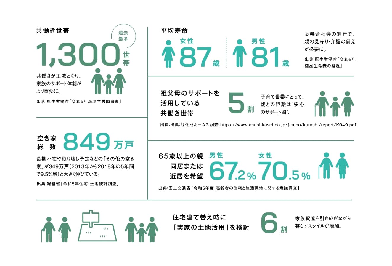共働き世帯が増え、平均寿命も延びるいま、家族が“ほどよい距離で支え合う”暮らし方が広がっています。子育てや家事を助け合いたい世帯が増える一方で、親世帯には見守りや安心できる住まいが必要に。さらに空き家の増加や、親世帯の多くが「子どもと近くに住みたい」と望む傾向も、近居・同居という選択を後押ししています。
