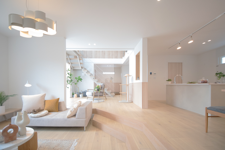 #2Fリビング#こだわりのキッチン#色を楽しむ#スキップフロア・中2階#こだわりの洗面台#オシャレな照明#こだわりの壁紙#螺旋階段