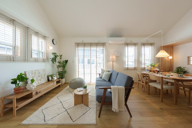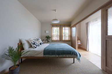 #和テイスト#工夫された空間づくり#アクセントクロス#シーリングファン#和室#土間