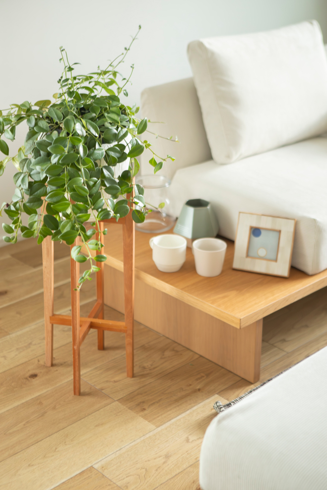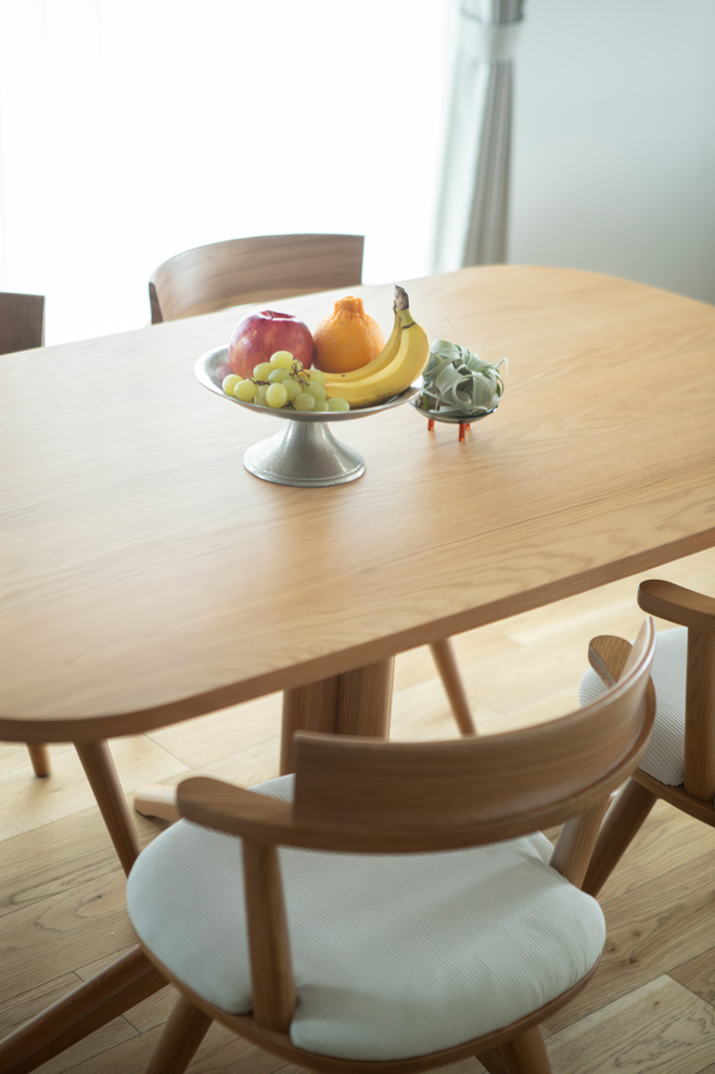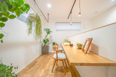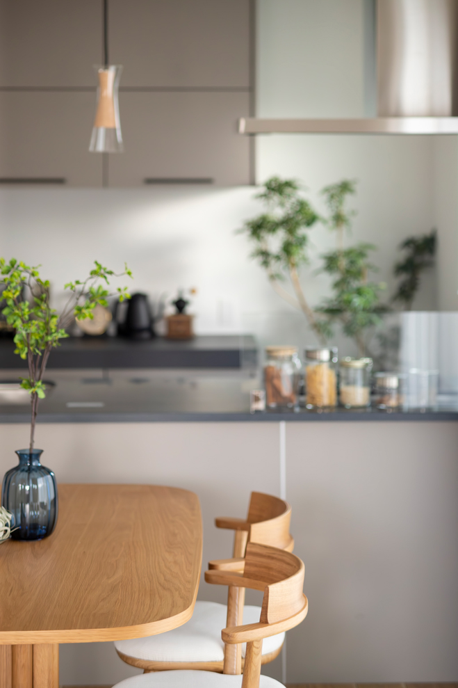 無垢材のテーブルと観葉植物が、ナチュラルな雰囲気を引き立てます。