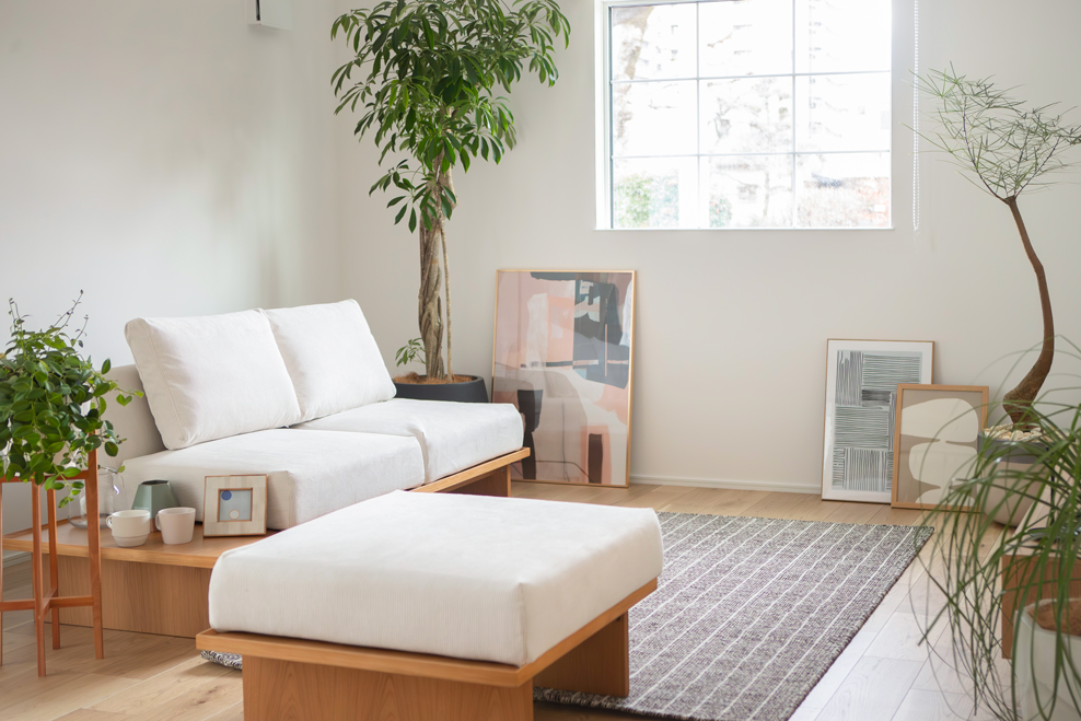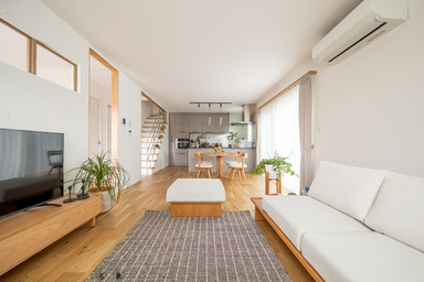 木の床とシンプルな家具が調和し、落ち着いた時間を過ごせるリビングに仕上がりました。