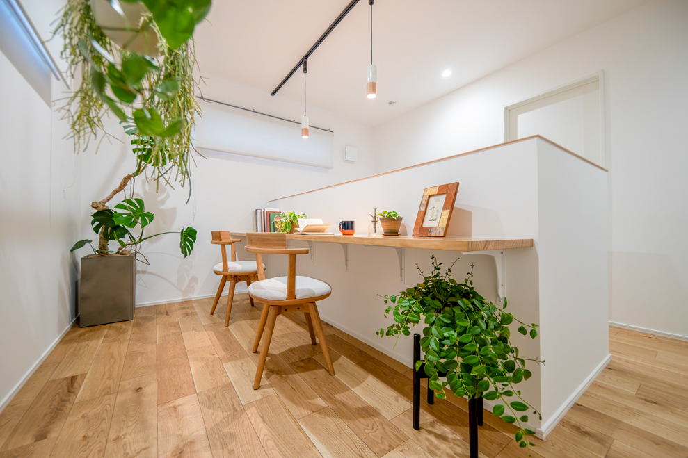 2階の一角には造作カウンターのワークスペースを配置。