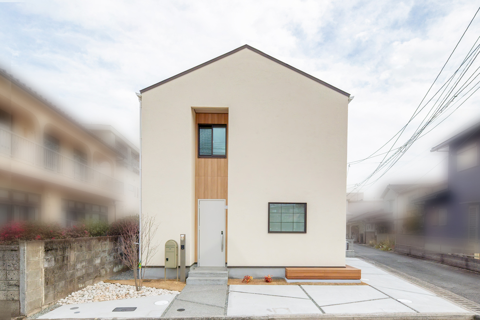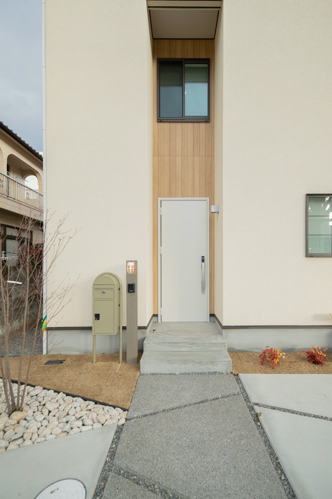 淡いカラーの外壁に木目のアクセントを加えることで、やさしさと温もりを感じられるデザインに仕上げました。