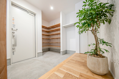 玄関には広々とした土間スペースと大容量の可動棚収納を設けました。