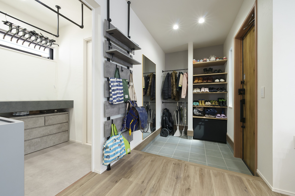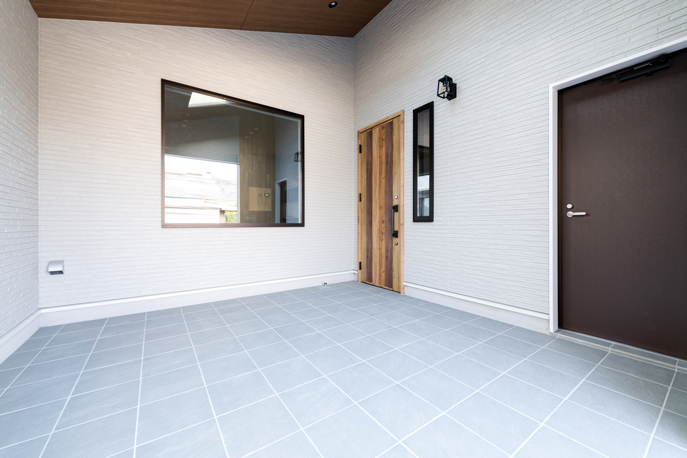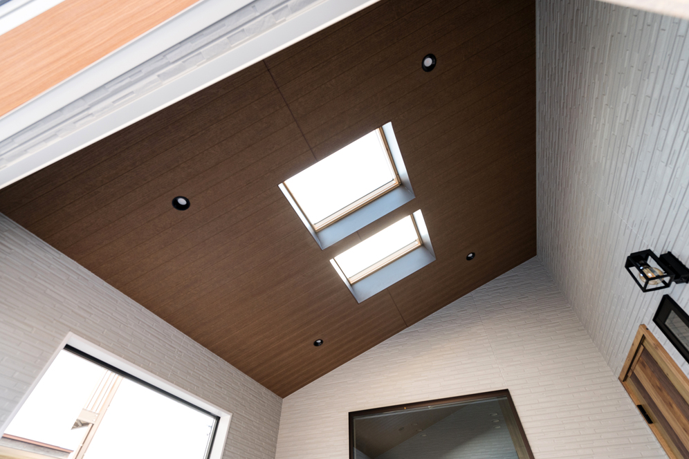 広々としたエントランスは、「SOU・SOU」の通り庭をイメージしたこだわりのデザイン。屋根には天窓を設け、光が降り注ぐ明るい空間になっています。また、リビングとは大きな窓でつながっており、お子さまたちがプール遊びをしている姿を、室内から見守ることもできます。これも奥さまのリクエストで実現したポイントの一つです。