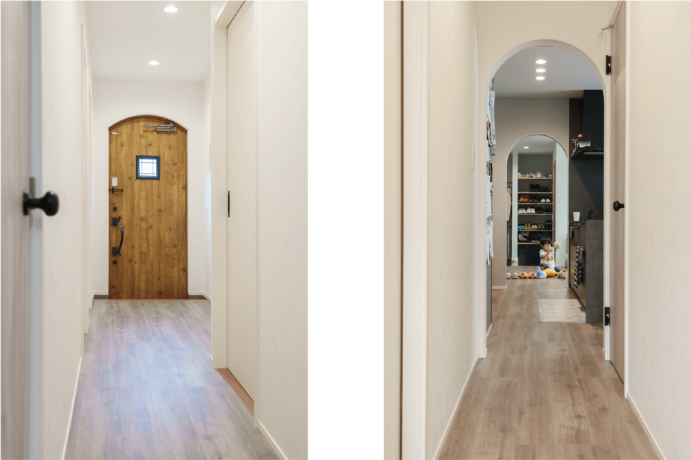 Oさま邸にはエントランスからつながる玄関のほかに、実はもう一つ玄関があります。これは奥さまがどうしても諦めきれなかった木目の扉を、家の一番奥に設置したもの。さらに、ドアのアーチ型を内装デザインにも活かし、二つの玄関をつなぐ通路を全てアーチ型で統一しました。遊び心と上質さを兼ね備えたデザインは、住まい全体の雰囲気づくりにも一役買っています。