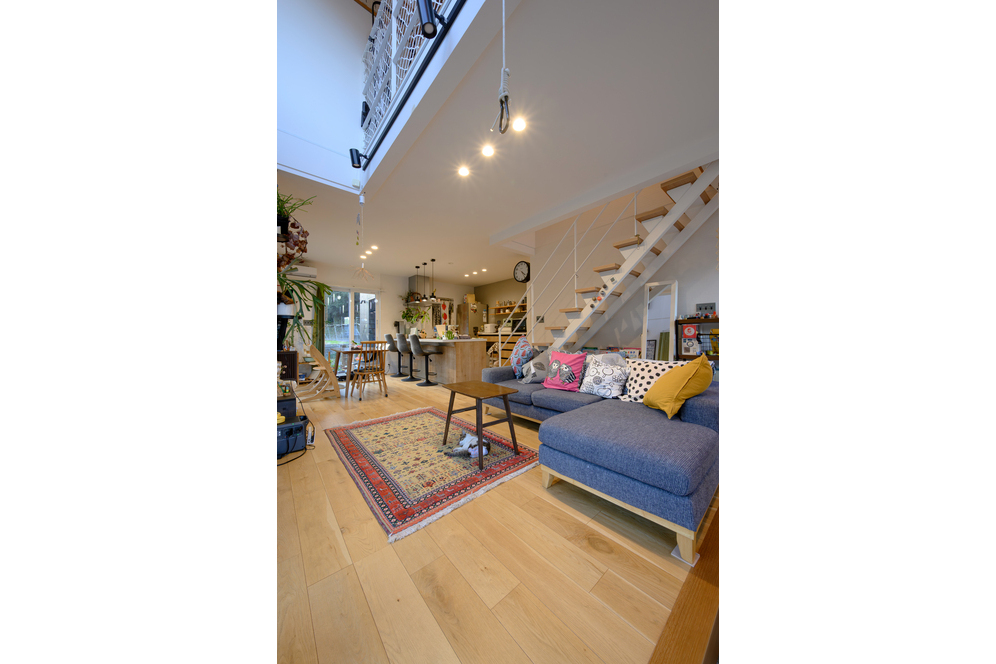 周囲には玄関からつながる土間があり、大きな窓から見える景色や吹き抜けも相まって、とても開放的でくつろげる空間が完成しました。