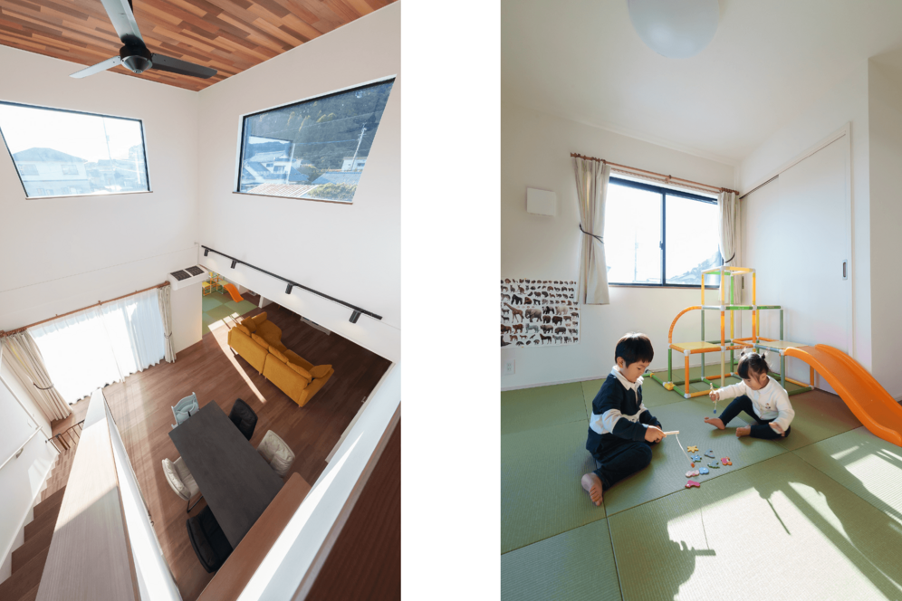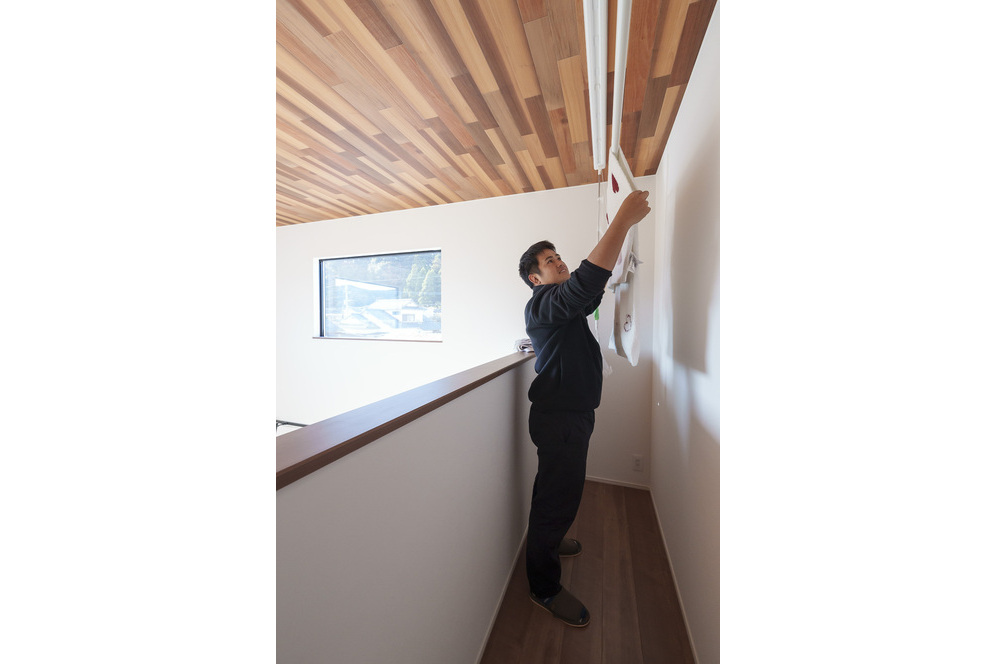 1年住んでみての感想を聞くと「こうすればよかったという後悔が全くない満足の仕上がりで、めちゃくちゃいいですよ!」とお二人とも即答。特に気に入っているのは、リビングから見上げた景色。吹き抜けの開放感と、上から見下ろした時に“家全体が見渡せる”感覚が、家族の気配につながっているといいます。