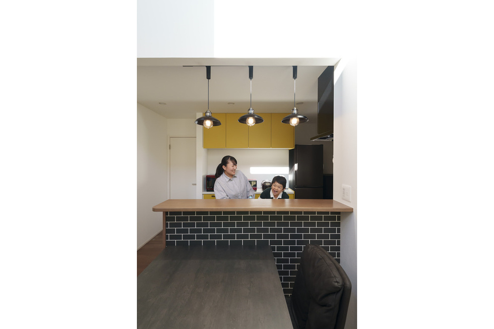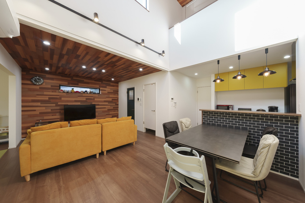 奥様がこだわって選んだ黄色のキッチンもアクセントになり、合わせてリビングのソファーも黄色をチョイス。幸せの黄色い空間が、Y様一家の明るい雰囲気によく似合っています。