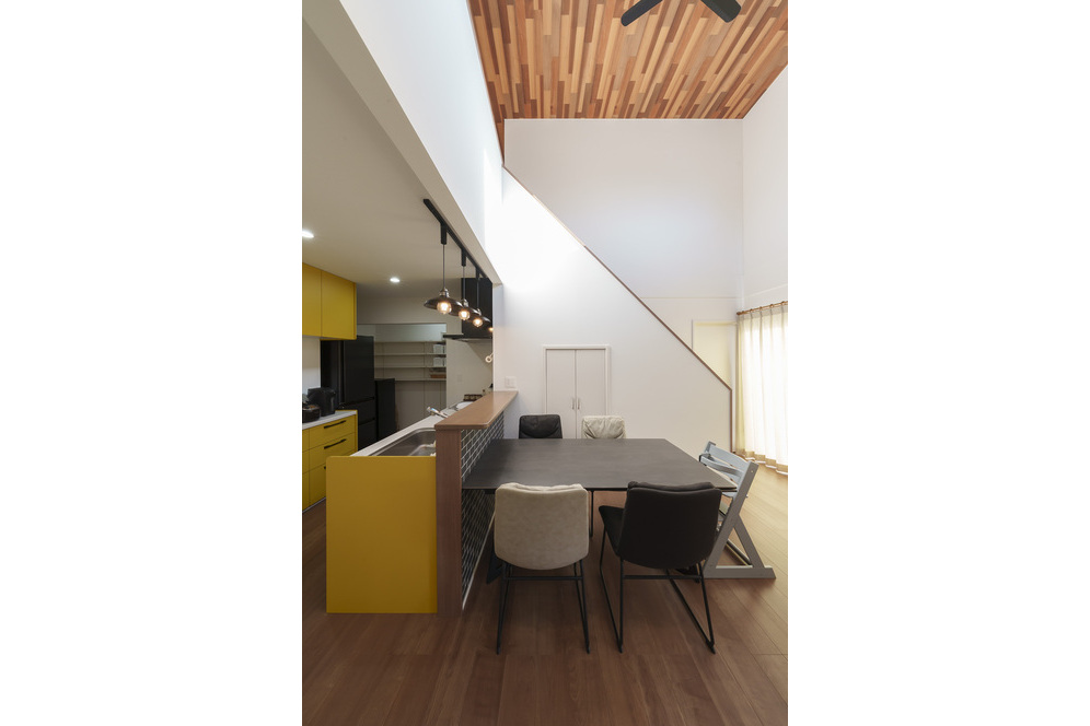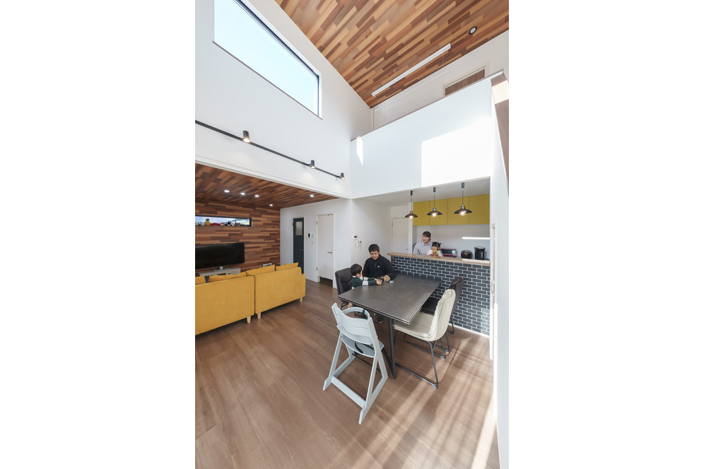 黄色がアクセントの吹き抜けのリビングで過ごす時間がお気に入り。