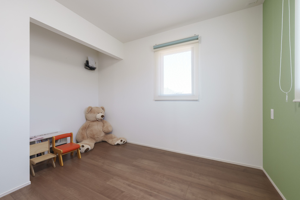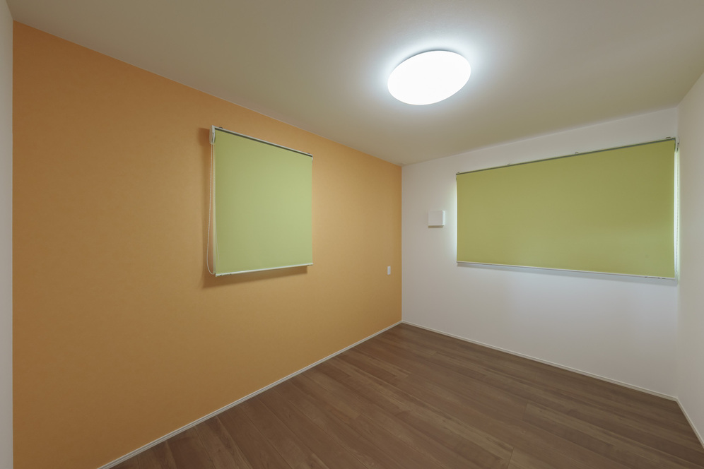 二階にある子ども部屋には、柑橘系のお子さんの名前を意識したアクセントクロスを使用し、明るく楽しい空間に。