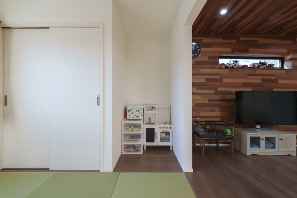 Y様邸の大きな特徴は「1階で暮らしが完結する」こと。平屋のような暮らしやすさを残しつつ、2階には子ども部屋を配置し、プライベート空間も確保しました。