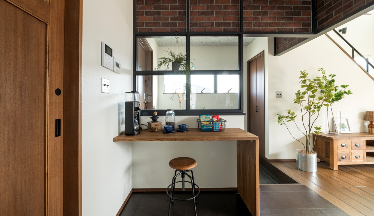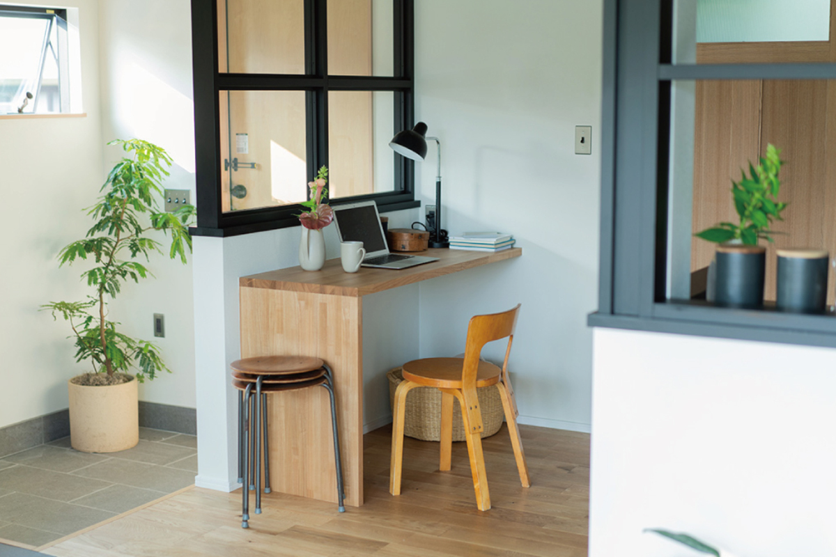 エントランスとキッチンの間に配置されたフリーデスク。専用にデザインされたデスクはノートパソコンを使った作業にもちょうどいいサイズ感。