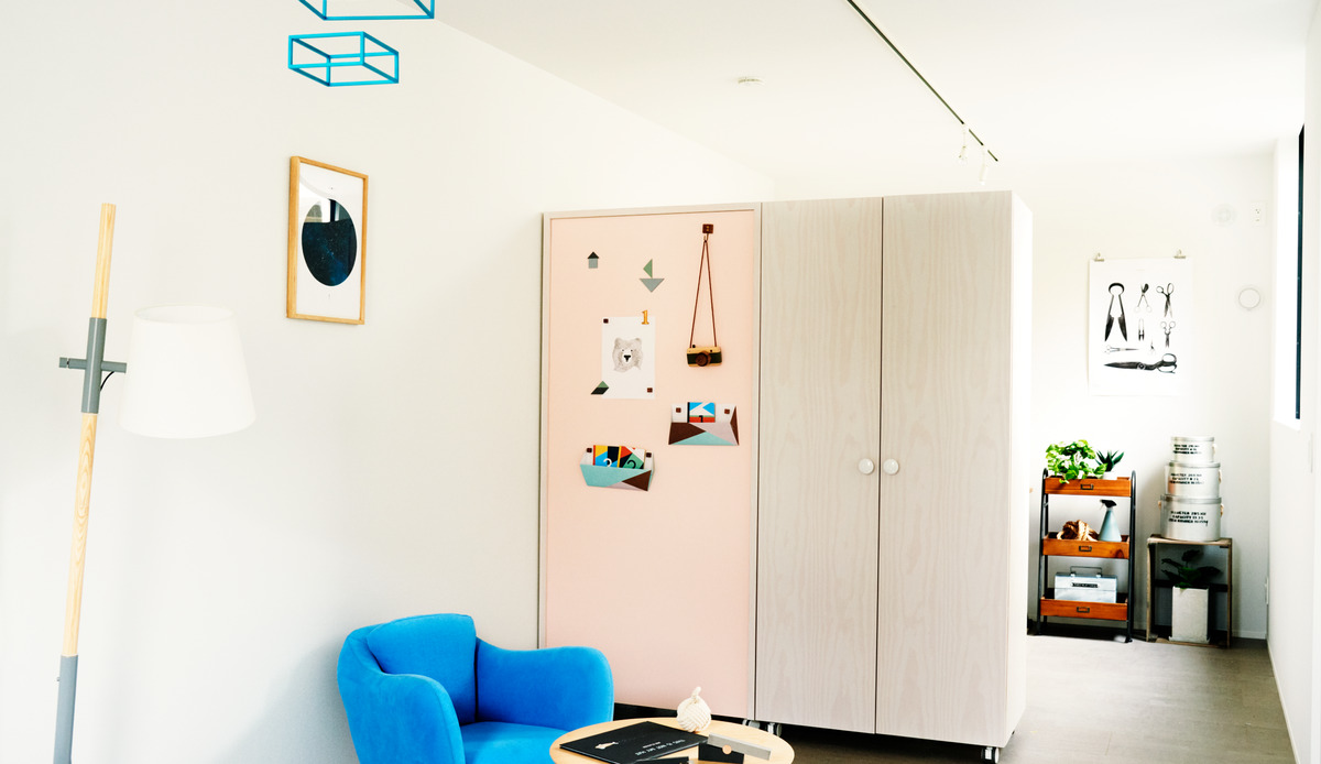 渡り廊下で繋がれた、家族の成長とライフスタイルの変化に寄り添ったふたつの部屋。広さを自由に変更できる間仕切りにもなるオリジナル家具は、クローゼット、背面は提示ボードにもなり、用途は多目的。