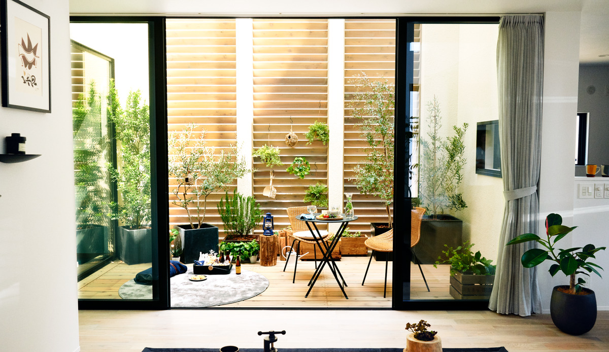 玄関を開けると目の前に広がるのが、この家の中心となるアウトドアリビング。リビングと一体感のあるこの空間では、グリーンを眺めながら、食事や読書を楽しむことができます。