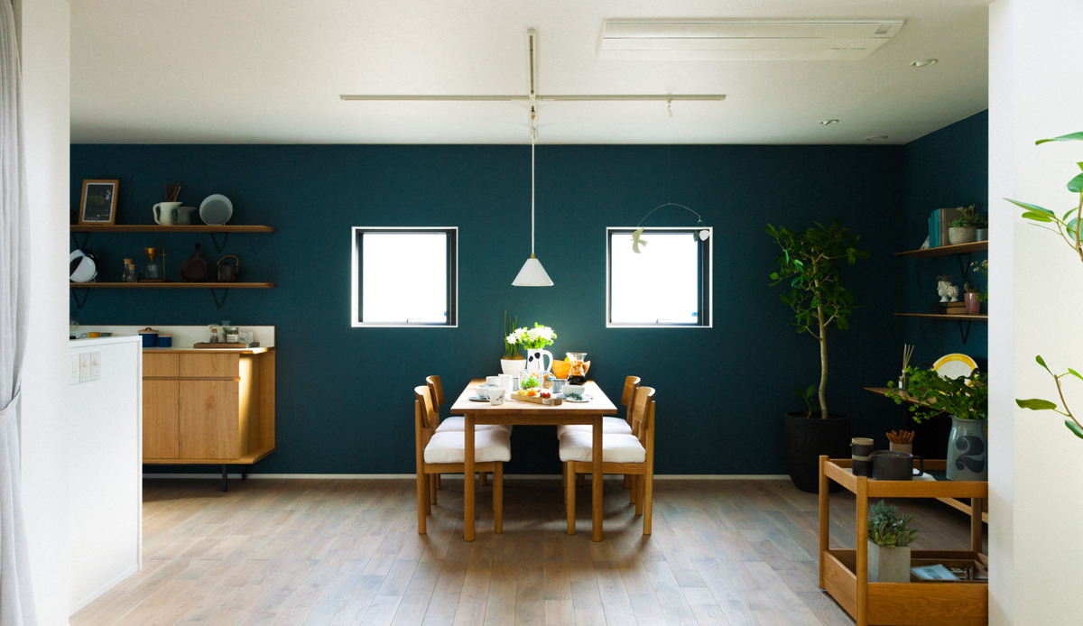 アクセントウォールで変化をつけた家族が集いたくなるダイニング