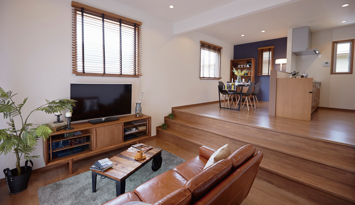 床の高さを半階ずつずらして立体的に空間をつなぐスキップフロア構造で、家の中に4層のスペースが登場。外観は一般的な2階建ての建物ながら、スペースを有効活用することで生活空間はワイドに。一つひとつが独立しているにゆるやかにつながり、いつも家族を感じられる安心感に満たされた暮らしができる。