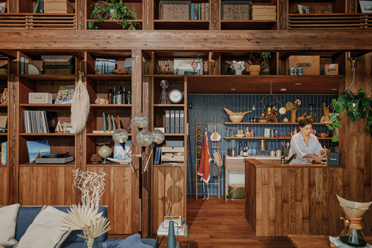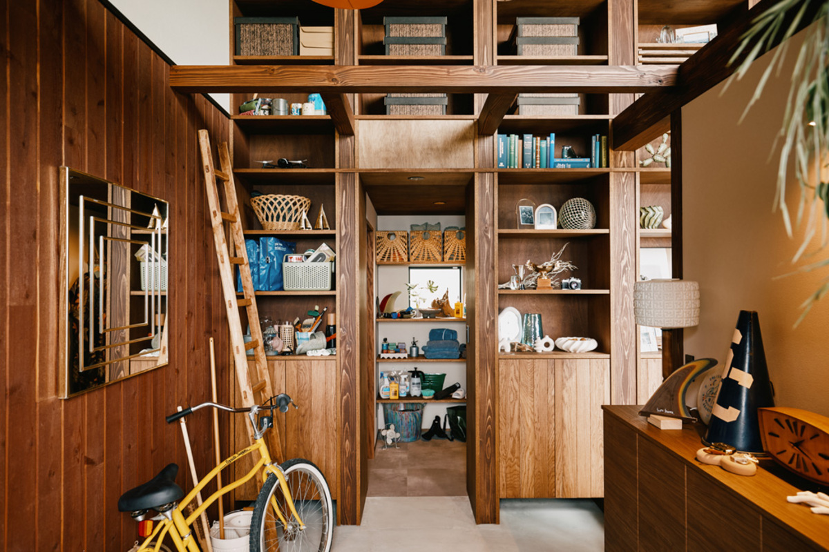 生活の中心、リビングルームで イメージしたのは モノが雑然と積み重なっていて、 たくさんの人々が行き交う広大な港。 モノに溢れれば溢れるほど幸せになるよう、 あらゆる荷物を“見せ収納”ができて 家族と訪れた人が愉快に快適に過ごせる 自慢の空間を作りました。