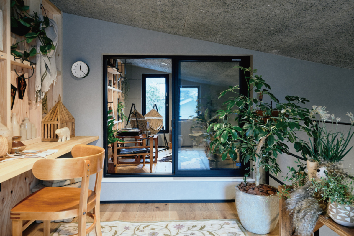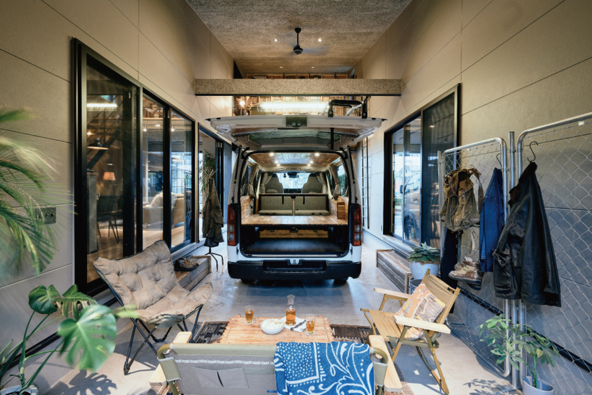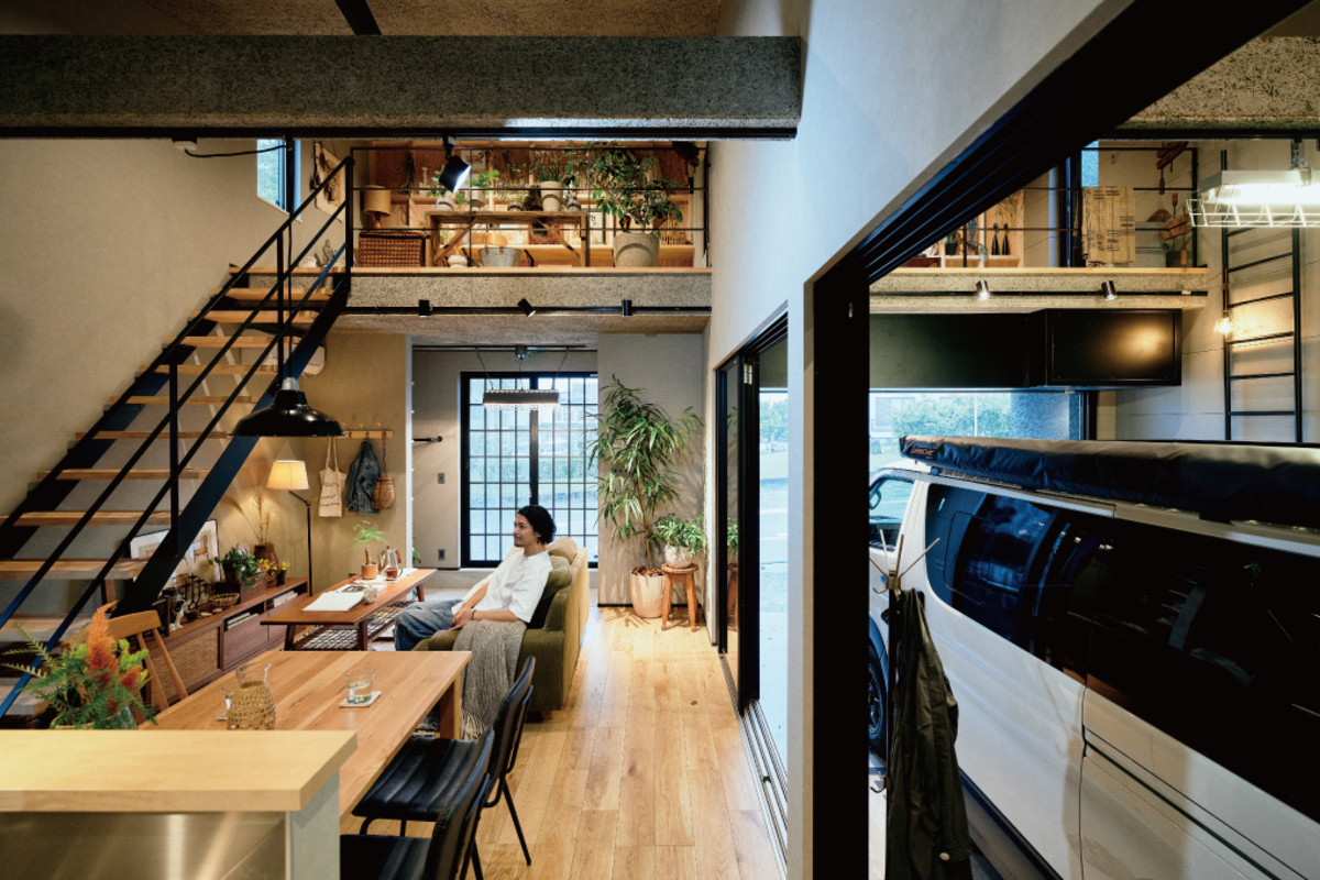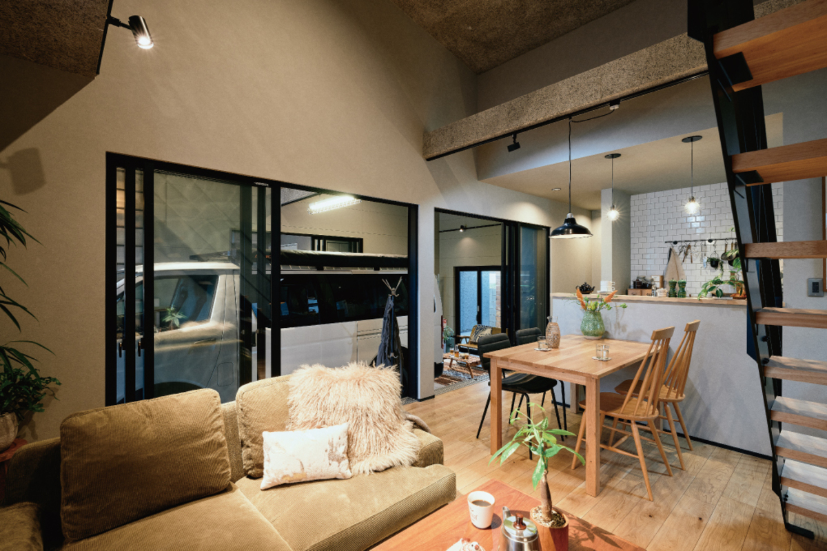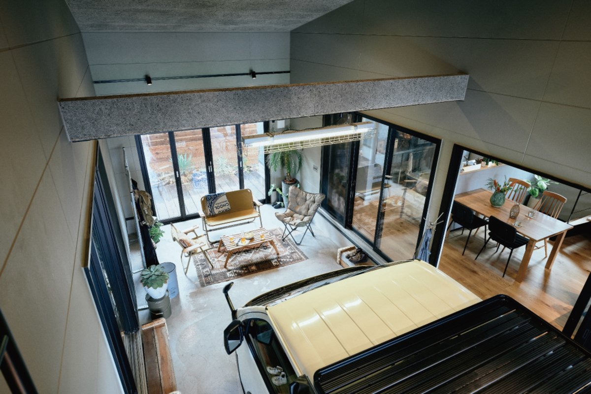 サッシを開け放つとガレージと一体感のある広々としたアウトドアリビングに。仲間や家族とのチルスペースとして使ったり、趣味のためのフリースペースとしても。中2階にはロフトスペースを設け、ギアをコレクションしたり、ワークスペースとしても使える。