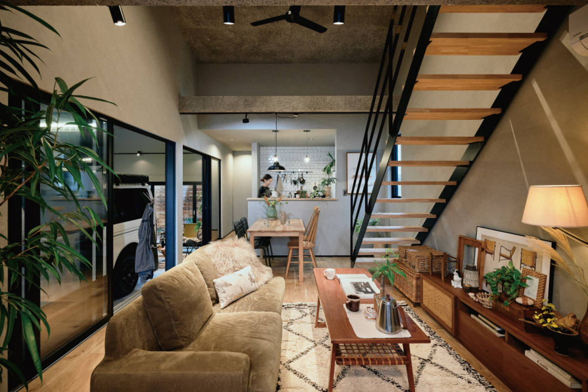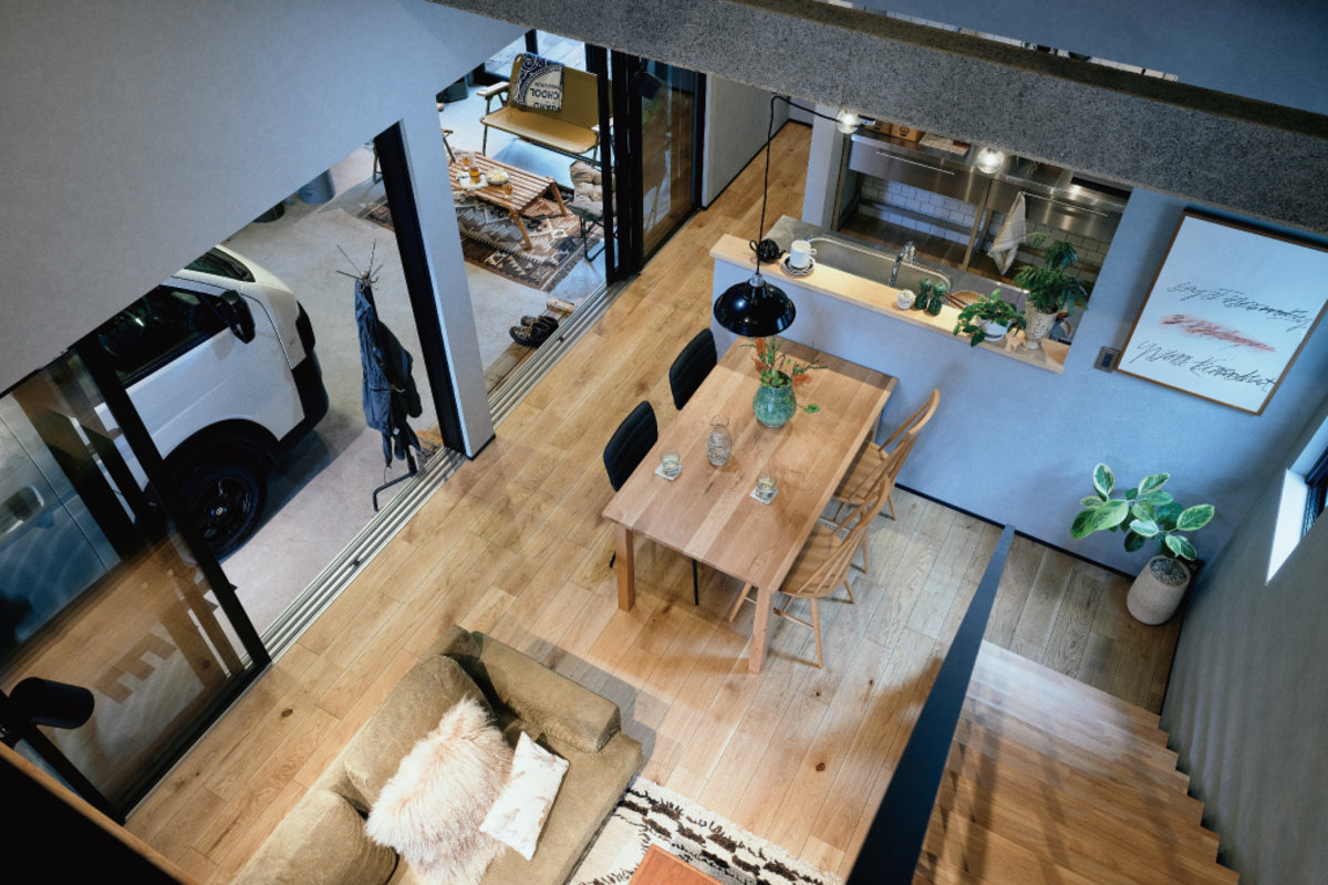 開放感のある大胆な間取りの中心になるのは、家の真ん中に配置した約28㎡の大きなガレージ。奥行も7.7mあり、ガレージと居住スペースのつながりある空間を実現。車好きにはもちろん、ライフスタイルに合わせて使い方はさまざま。