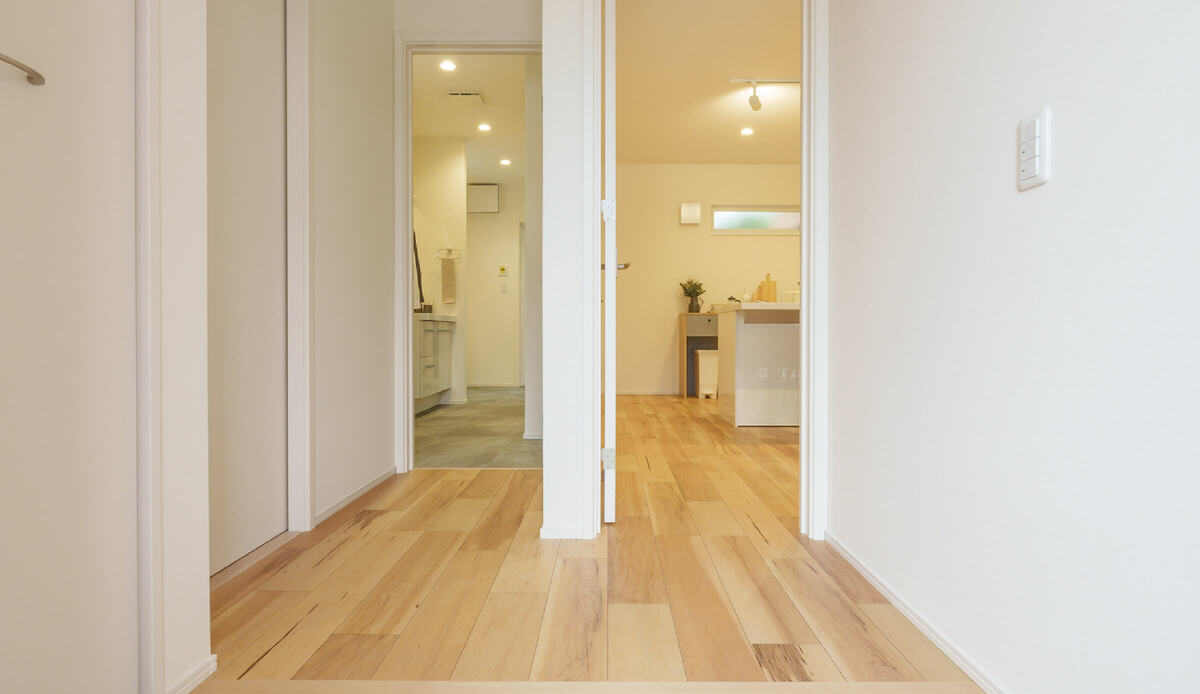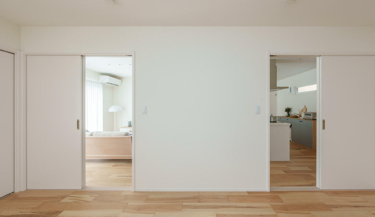 平屋は、2階建てなどよりも構造的に必要となる壁や柱が少なくすむので、すっきりとした間取りづくりが可能です。また、生活空間がワンフロアで完結するため、各居室との連動性が生まれ、生活動線もシンプルでスマートに。