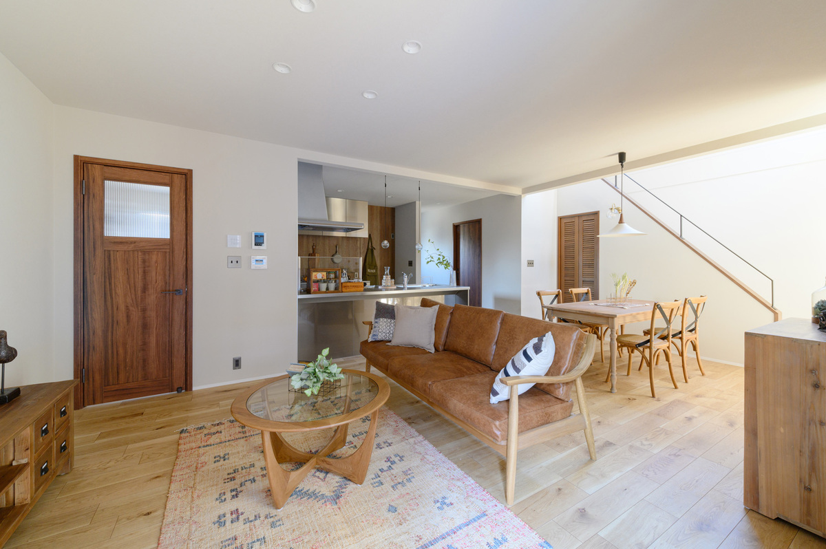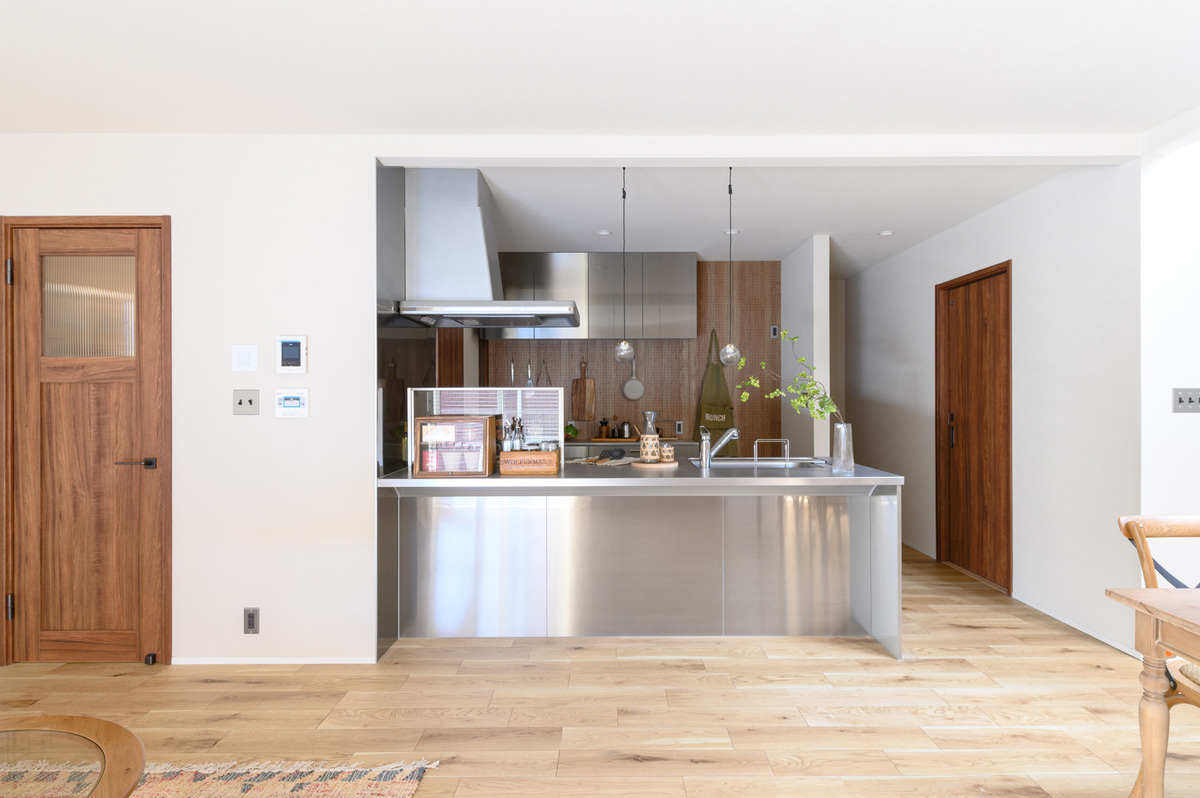 1階が見渡せる対面キッチンや、吹き抜けのリビングイン階段は、居間を導線の中心に考えた、家族のコミュニケーションが生まれる設計。