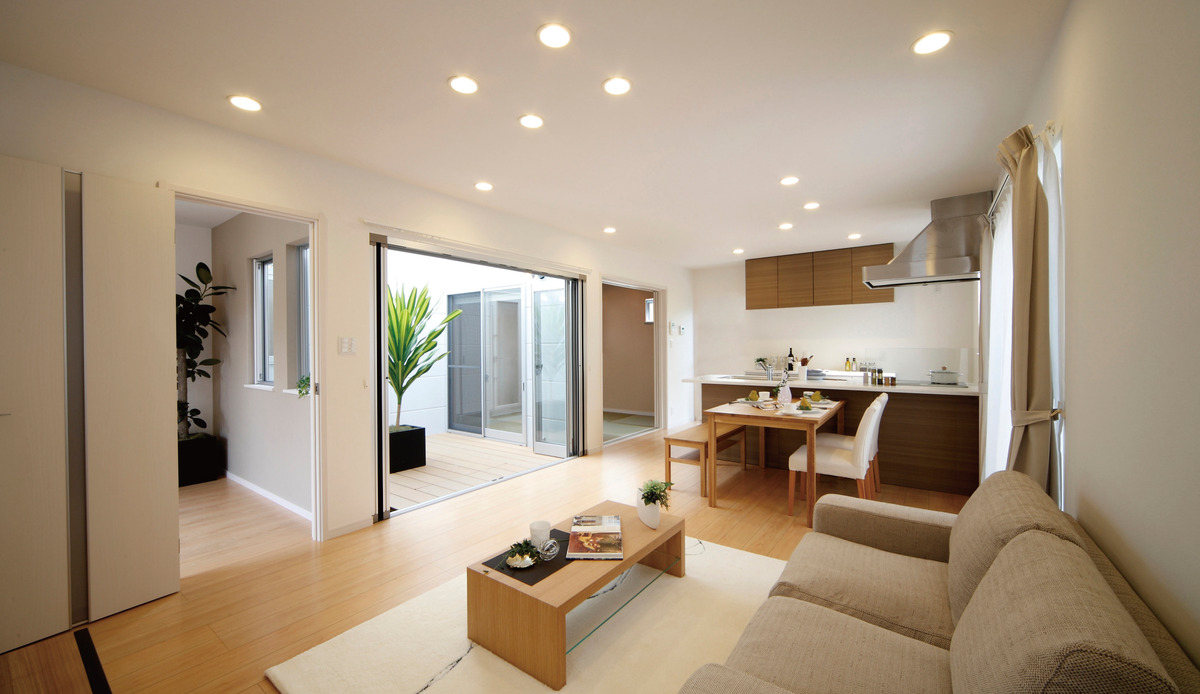 子供たちの気配を感じながら、安心して家事ができます。サッシを開放すれば、内と外が一体となった広々とした居住空間が出現します。