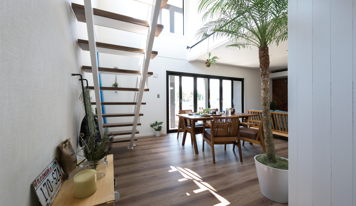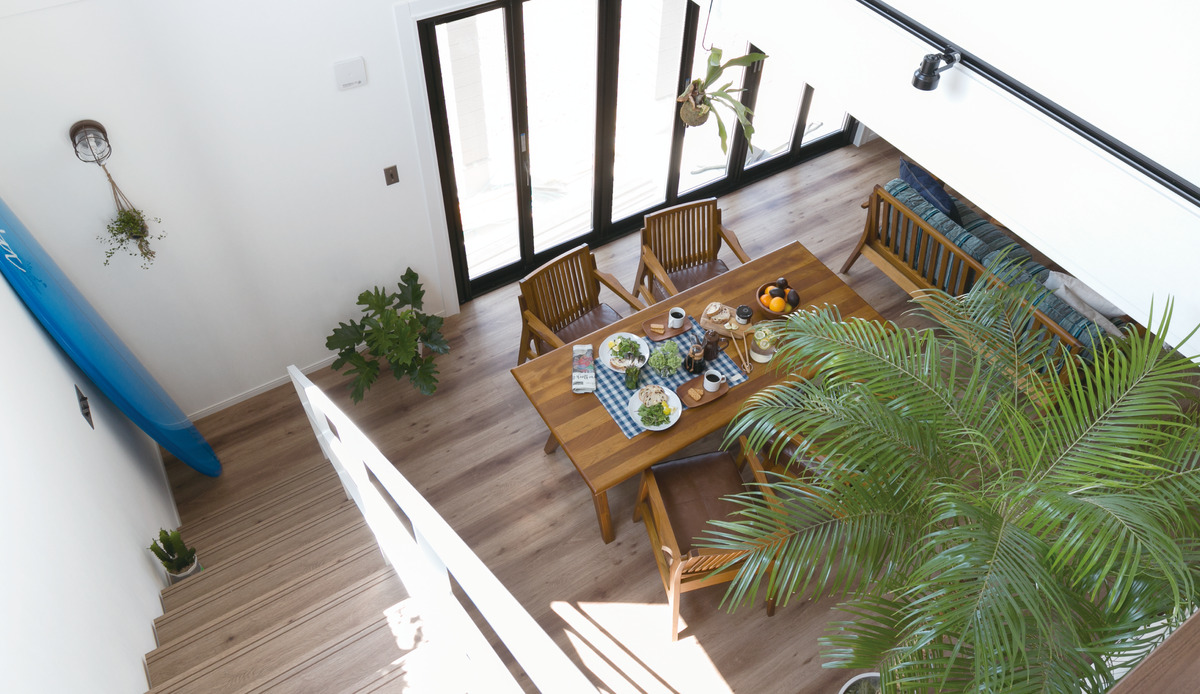 空間に伸びやかさをプラスし、明るくオープンな印象を与える吹き抜け。大きな窓から柔らかな光が降り注ぎます。