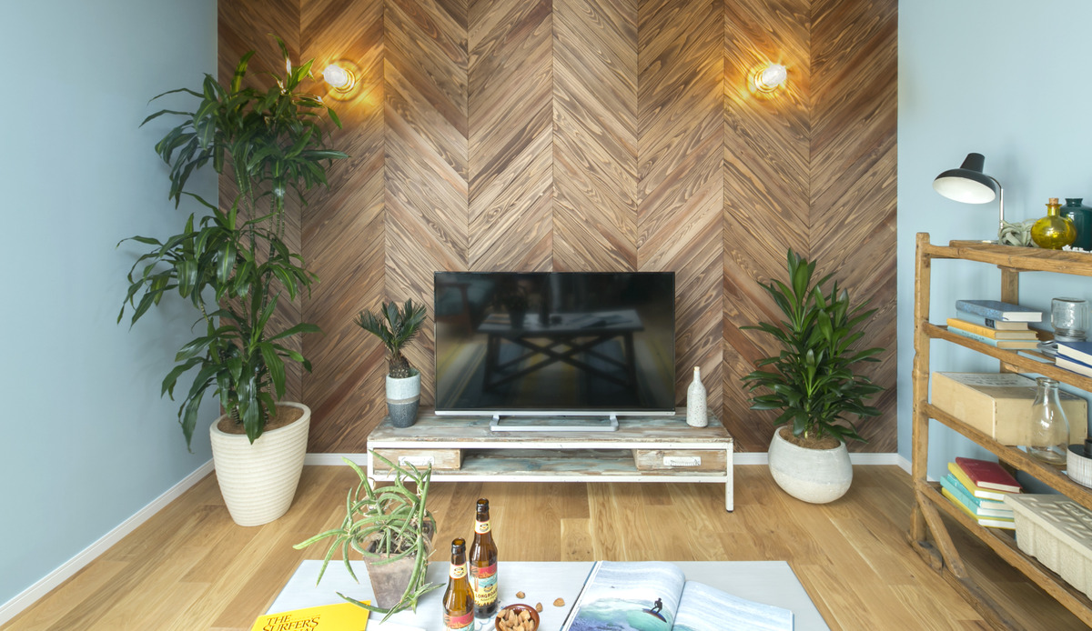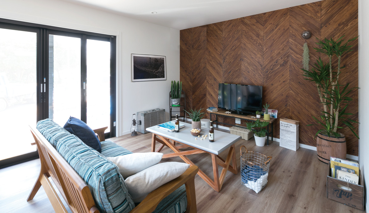 ウッディな温もりと上質なデザインテイストが特徴のヘリンボーンの壁。家族の生活の中心となるリビングのリゾート感を演出します。