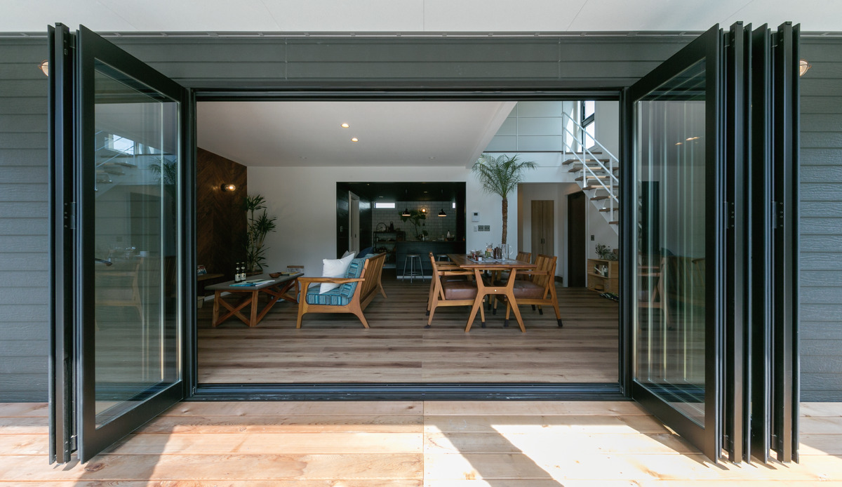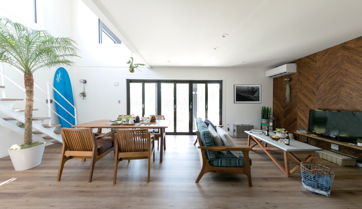 リビングにはビーチや庭が見渡せる、大開口の窓を採用しました。空間を広々と見せ、開放的で明るいライフスタイルを演出します。