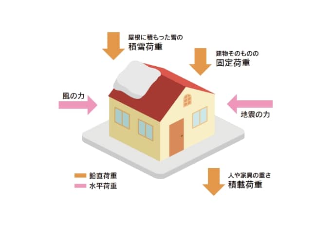 建物自体の重さや人や家具の重さ、地震や風によって受ける力を数値として算出し、建築物の必要な強度を求めます。