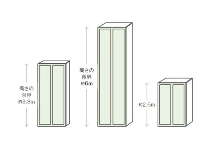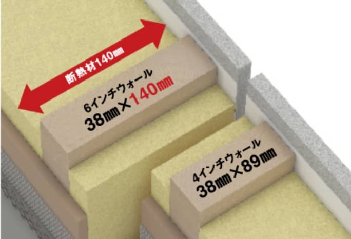 「2×4ウォール」は、壁の高さが約3.8mまでなのに対し、「2×6ウォール」は約6mまで対応が可能。この高い部材強度で強固な外壁が造られています。