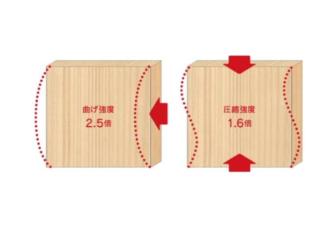 横からの揺れ方に対して曲げ強度が約2.5倍、上からの荷重に対しての圧縮強度が約1.6倍という強さを発揮します。